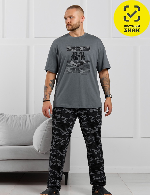 Костюм мужской, состоящий из футболки и брюк. Футболка однотонная с принтом на груди; модель свободная, со спущенной линией плеч, овальным вырезом горловины. Брюки из полотна с набивным рисунком эксклюзивного дизайна, прямые, с боковыми карманами с обтачными входами, на притачном поясе с отстроченной эластичной тесьмой.