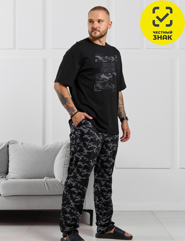 Костюм мужской, состоящий из футболки и брюк. Футболка однотонная с принтом на груди; модель свободная, со спущенной линией плеч, овальным вырезом горловины. Брюки из полотна с набивным рисунком эксклюзивного дизайна, прямые, с боковыми карманами с обтачными входами, на притачном поясе с отстроченной эластичной тесьмой.