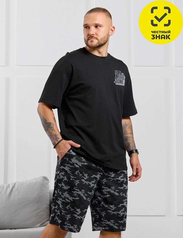 Костюм мужской, состоящий из футболки и шорт. Футболка однотонная с принтом на груди; модель свободная, со спущенной линией плеч. Шорты из полотна с набивным рисунком эксклюзивного дизайна, с боковыми карманами с обтачными входами, на притачном поясе с отстроченной эластичной тесьмой.