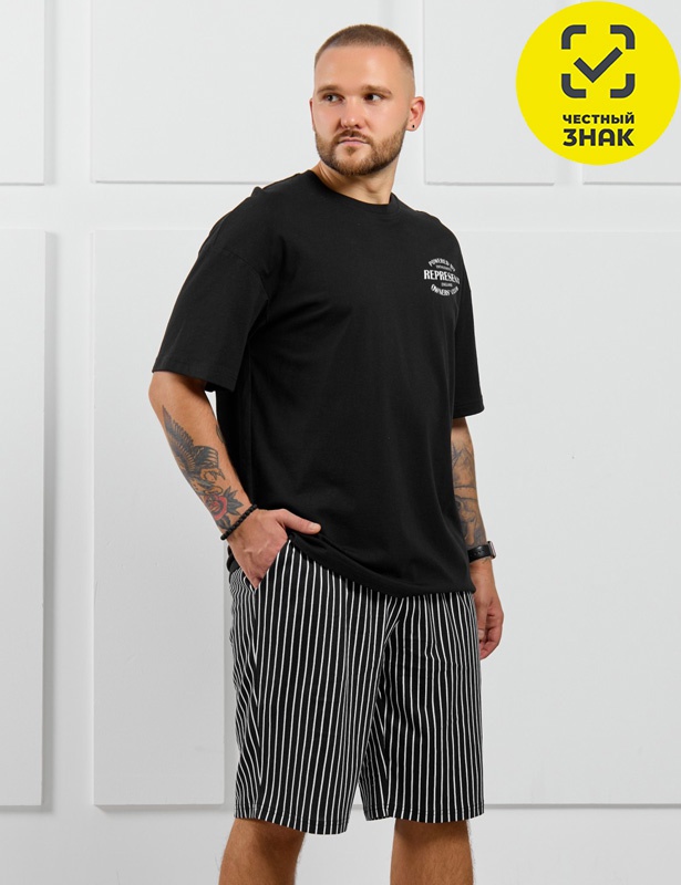Костюм мужской, состоящий из футболки и шорт. Футболка однотонная с принтом на груди; модель свободная, со спущенной линией плеч. Шорты из полотна с набивным рисунком в узкую черно-белую полоску, с боковыми карманами с обтачными входами, на притачном поясе с отстроченной эластичной тесьмой.