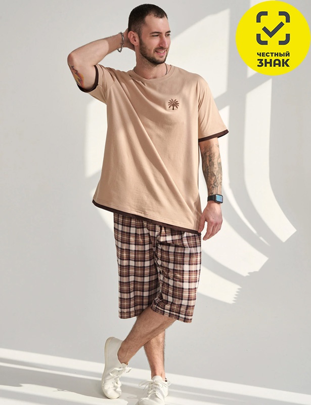 Мужской комплект состоит из футболки и бридж. Футболка с коротким рукавом и округлой горловиной, спереди принт. Бриджи изготовлены из набивного полотна, на поясе на резинке.