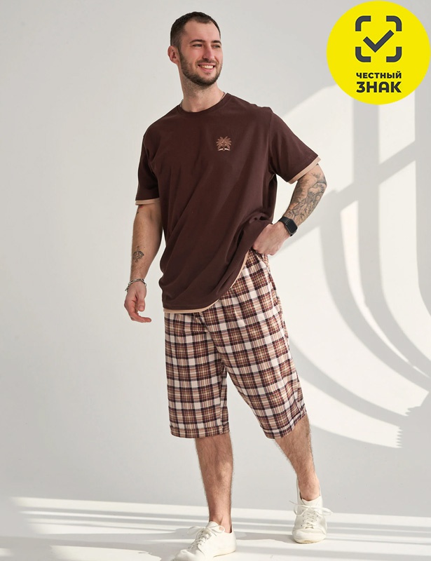 Мужской комплект состоит из футболки и бридж. Футболка с коротким рукавом и округлой горловиной, спереди принт. Бриджи изготовлены из набивного полотна, на поясе на резинке.