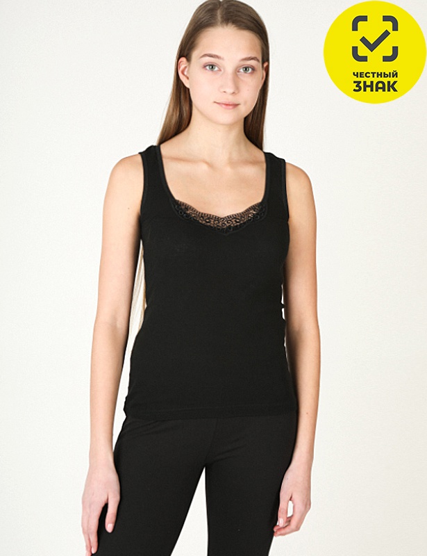 Майка женская, из нежного трикотажного полотна, широкие лямки, облегающий силуэт, кружевная вставка.