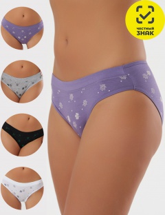 Трусы-слипы женские из набивного модала, притачная резинка по верхнему срезу, нижние срезы окантованы. Трусы упакованы в картонную бирку-хедер, без коробки.