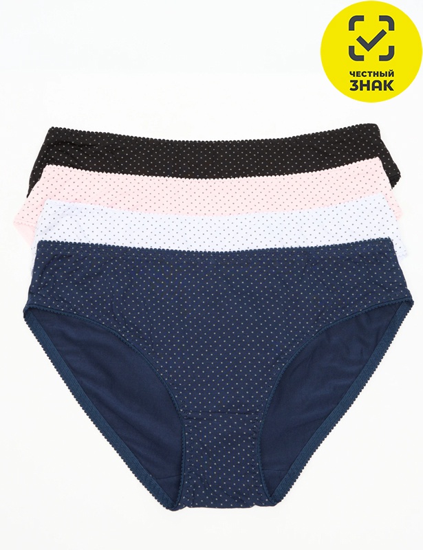 Трусы женские классического кроя из набивного полотна, нижние срезы окантованы, по верхнему срезу продета эластичная тесьма. Трусы упакованы в картонную бирку-хедер, без коробки.