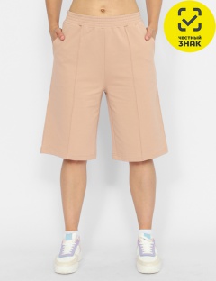 Женские шорты из футера с эластичным поясом, боковыми карманами, со стрелками-строчками, длиной до колен.