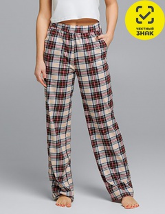 Брюки женские из набивного полотна, прямые, на эластичном поясе, карманы по бокам.