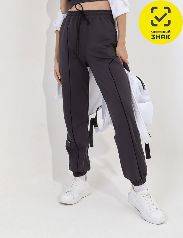 Женские брюки изготовлены из трикотажного полотна «футер двунитка» с добавлением лайкры. Пояс брюк притачной, с эластичной тесьмой внутри и шнурком, продетым через две петли в центре пояса. В боковых швах расположены карманы, а по низу брюк проходит эластичная тесьма. Правая половина брюк состоит из трёх частей, а левая — из двух частей фигурной формы, соединённых кантом контрастного цвета. Декоративный элемент настрочен по горизонтальному шву правой половины брюк.