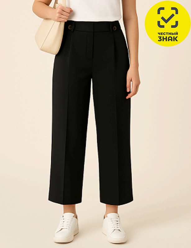 Женские брюки прямого свободного кроя. Модель с высокой посадкой и эластичной вставкой сзади для комфортной посадки по талии. Декоративные пуговицы на поясе придают образу изысканный акцент. Боковые карманы добавляют функциональности, а укороченная длина делает образ современным и универсальным.