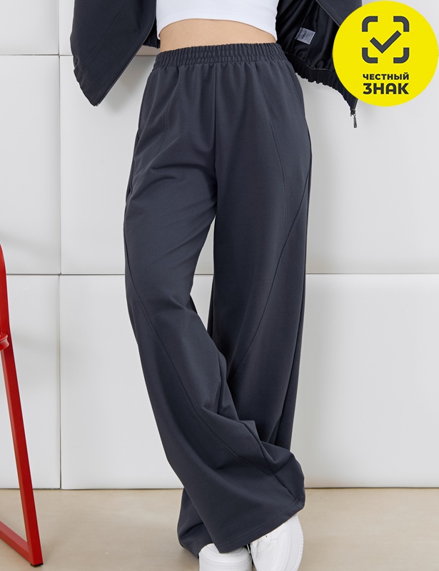 Брюки молодежные из трикотажного гладкокрашенного полотна «футер», длинные, на притачном поясе с эластичной тесьмой внутри, с карманами в боковых швах. Правая и левая половины брюк состоят из трех частей, скроенных по косой, с отделочными строчками по шву стачивания.