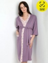 Халат из трикотажного полотна кулирного переплетения, на запахе, с рукавами длиной 3/4. По линиям борта и горловине, а также по входам в карманы - притачные планки из отделочного материала. Съёмный пояс фиксируется на линии талии при помощи двух шлевок из окантовки в боковых швах.