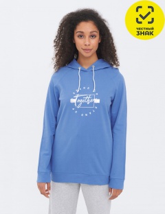 Толстовка женская из футера петли свободного кроя, с капюшоном на завязках, длинные рукава реглан с манжетами, притачной пояс по низу изделия, полочка украшена шелкографией.