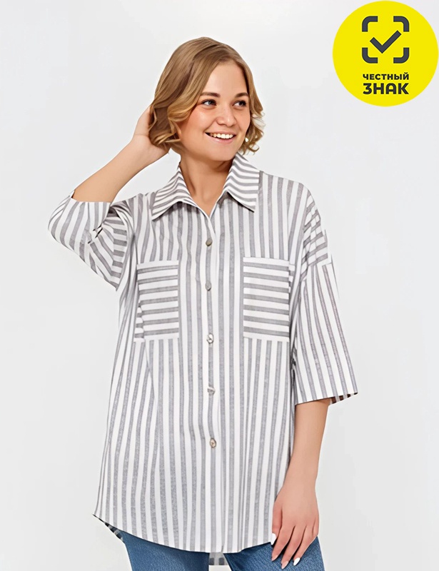 Рубашка женская из набивной кулирки рукав длиной 3/4 со спущенной линией плеча, застежка на пуговицы, отложной воротник, накладные карманы.