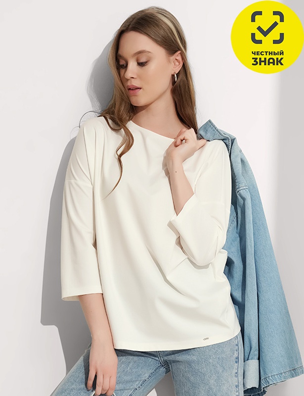 Джемпер прямого свободного кроя из трикотажного полотна интерлок. Спущенная линия плеча, длинный рукав. Округлая горловина с внутренней окантовкой. Спереди металлическая нашивка.