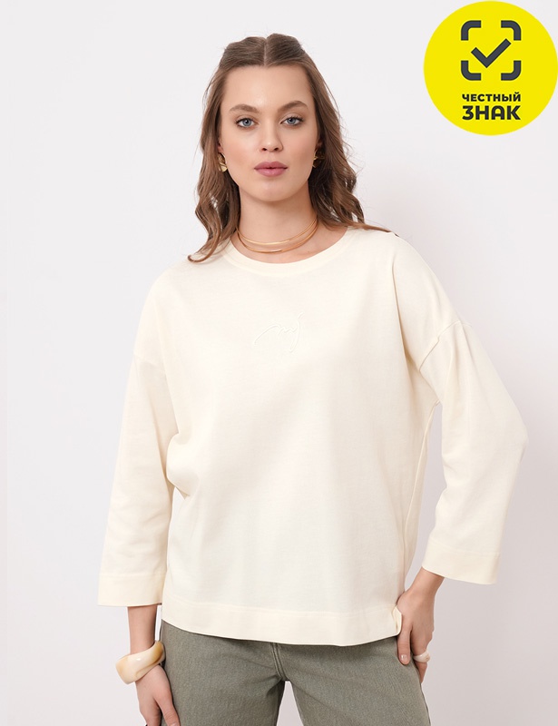 Фуфайка из хлопкового трикотажного полотна умеренного объема. Длинный рукав со спущенной линией плеча. Округлая горловина с обтачкой. Сзади средний шов. По низу рукава и изделия широкая подгибка с разрезами. Спереди вышивка с пеной.