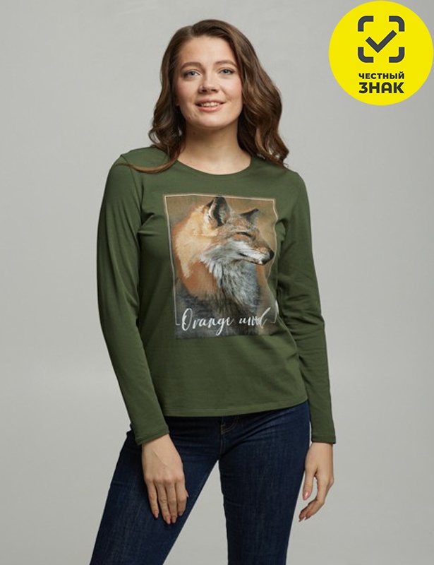Джемпер женский прямого кроя, с длинными втачными рукавами, округлая горловина окантована, на полочке выполнена печать.