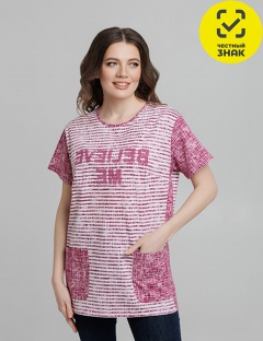 Футболка женская прямого кроя удлиненная, выполнена из набивных полотен с разным рисунком, с коротким втачным рукавом, округлая горловина, накладные карманы на полочке.