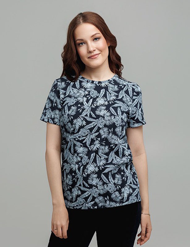 Футболка женская из набивного полотна, с коротким втачным рукавом, округлая горловина обработана бейкой из основного полотна.