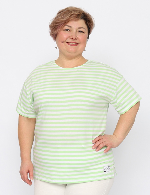 Футболка оверсайз из полосатого полотна, длиной до середины бедра, с разрезами по бокам. Рукав до локтя. Круглая горловина обработана узкой притачной обтачкой. Полочка декорирована жаккардовой нашивкой.