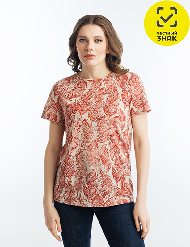 Футболка женская из набивного полотна, с коротким втачным рукавом, округлой горловиной.