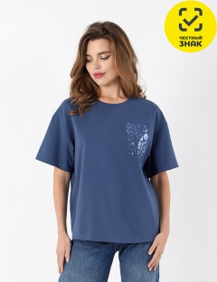 Футболка молодежная из гладкокрашеного трикотажного полотна «кулирка с лайкрой», свободного покроя, с втачными короткими рукавами и вышивкой пайетками на полочке. Горловина овальной формы обработана втачной планкой с отделочной строчкой по шву притачивания.