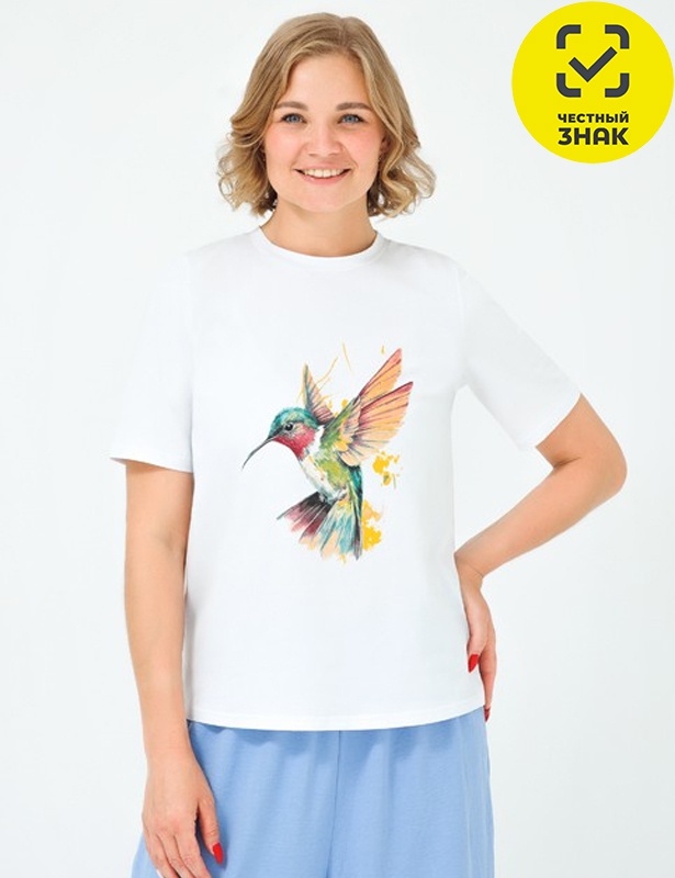 Женская футболка из трикотажного полотна с эластаном имеет короткий втачной рукав, прямой крой и округлую горловину, на полочке печать.