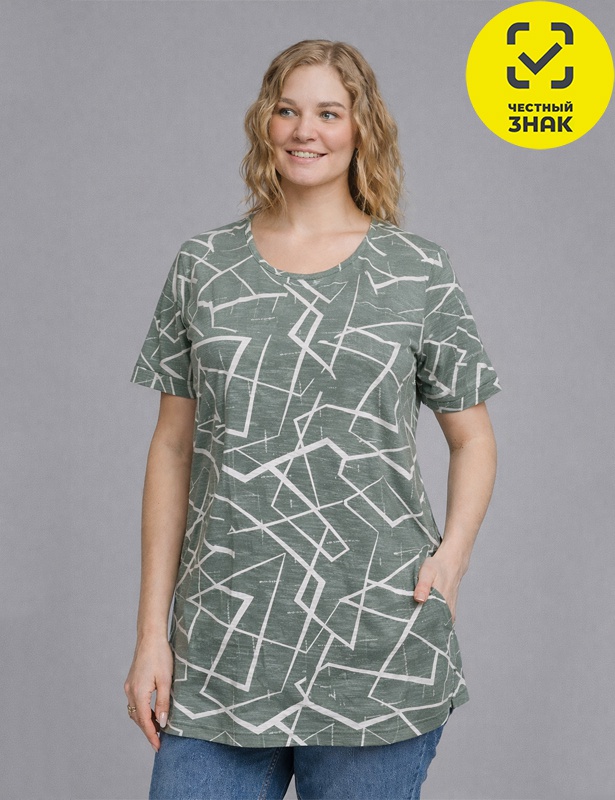 Футболка женская из набивного полотна, округлая горловина и короткие втачные рукава.