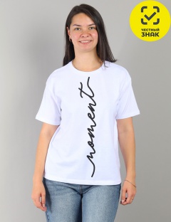 Футболка прямого силуэта длиной по линию бедер. Со слегка спущенными плечами, короткий рукав. Круглая горловина обработана узкой притачной обтачкой из рибаны с эластаном. Полочка декорирована принтом.