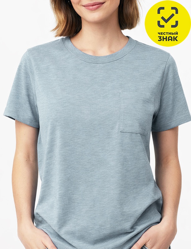 Футболка прямого силуэта со спущенным плечом. Полотно флам эффект(неравномерная пряжа). По низу рукава притачной манжет с отворотом и закрепками . На груди с левой стороны накладной карман. Круглая горловина обработана притачной обтачкой из рибаны с эластаном. Горловина спинки закрыта экстрафорной тесьмой