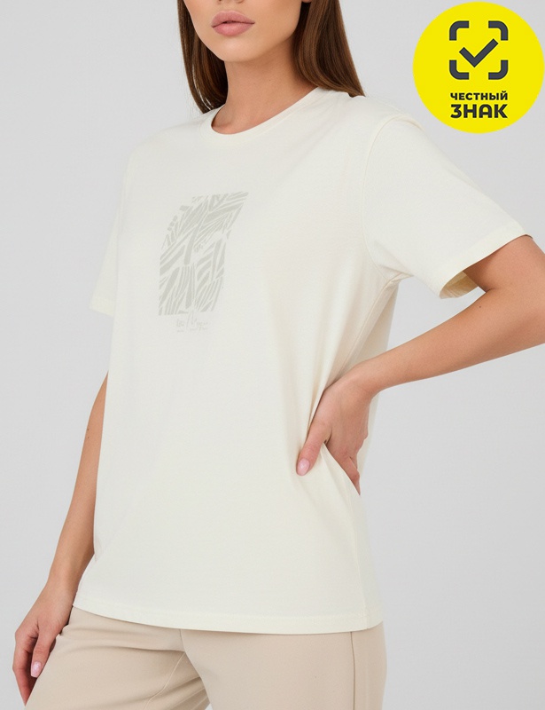 Футболка прямого силуэта с коротким рукавом. Круглая горловина обработана притачной обтачкой из рибаны с эластаном. Горловина спинки закрыта экстрафорной тесьмой. На полочке принт" МАГИЯ В ТЕБЕ"