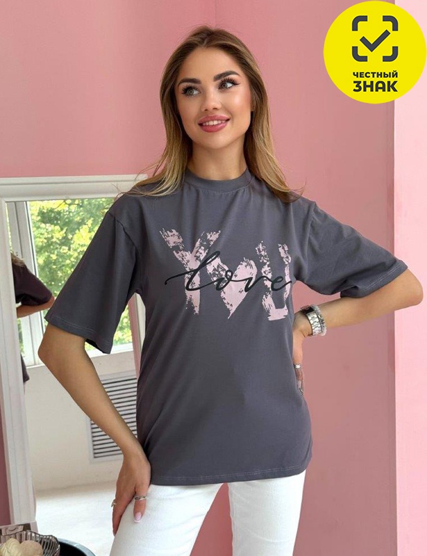 Футболка женская с короткими рукавами, свободного силуэта. Горловина круглая, обработана притачной бейкой из рибаны с эластаном. Перед футболки декорирован принтом.