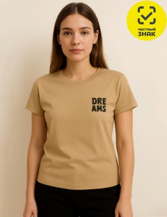 Футболка из мягкого хлопкового трикотажа. Минималистичный акцент — надпись "DREAMS" на груди, выполненная фактурными буквами. Классический прямой крой и круглый вырез обеспечивают комфортную посадку.