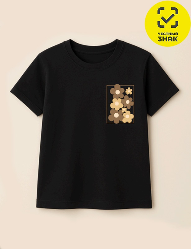 Футболка женская из мягкого хлопкового трикотажа в базовом цвете.Минималистичный акцент — принт в виде стилизованных цветов в тёплой бежево-горчичной гамме, расположенный на груди в рамке.