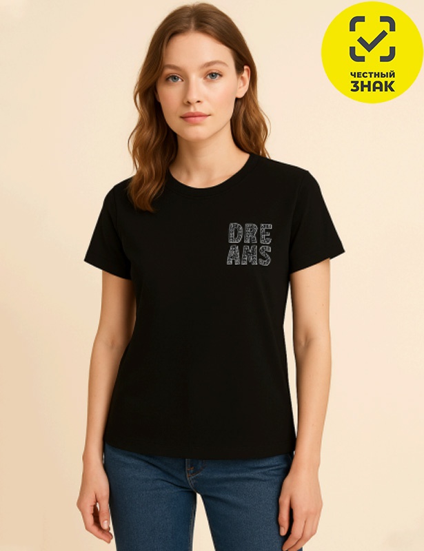 Футболка из мягкого хлопкового трикотажа. Минималистичный акцент — надпись "DREAMS" на груди, выполненная фактурными буквами. Классический прямой крой и круглый вырез обеспечивают комфортную посадку.