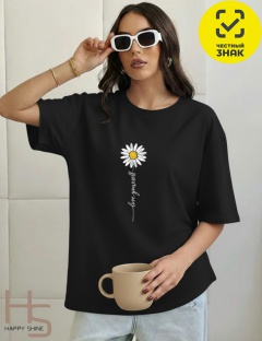 Футболка женская с короткими рукавами, свободного силуэта. Горловина круглая, обработана притачной бейкой. Перед футболки декорирован принтом.