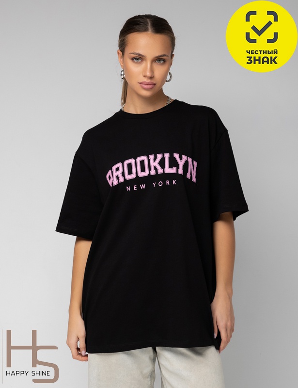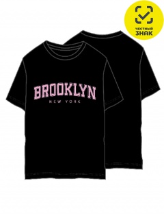 Футболка женская с короткими рукавами, свободного силуэта. Горловина круглая, обработана притачной бейкой. Перед футболки декорирован принтом.