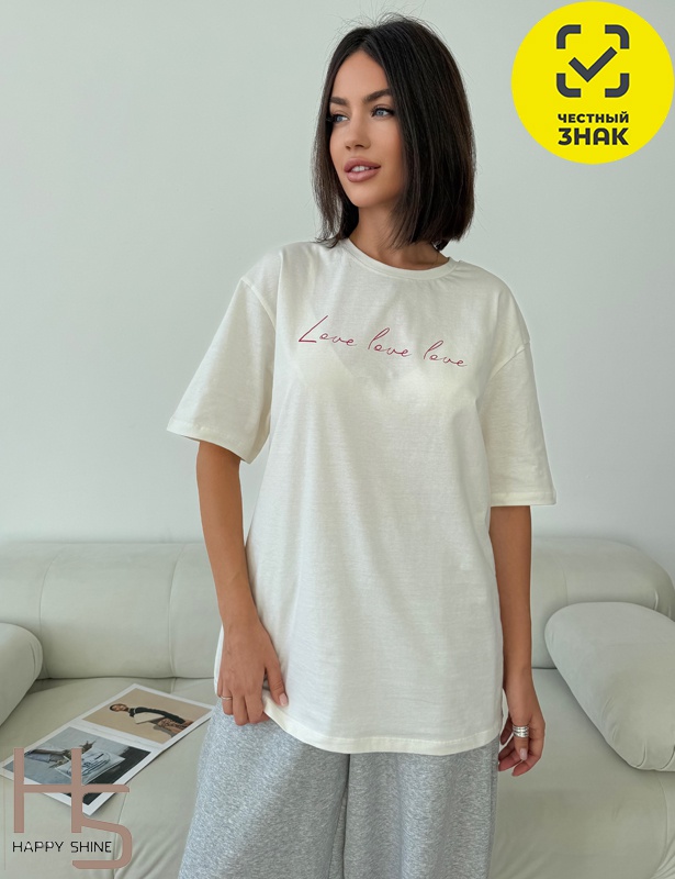 Футболка женская с короткими рукавами, свободного силуэта. Горловина круглая, обработана притачной бейкой. Перед футболки декорирован принтом.