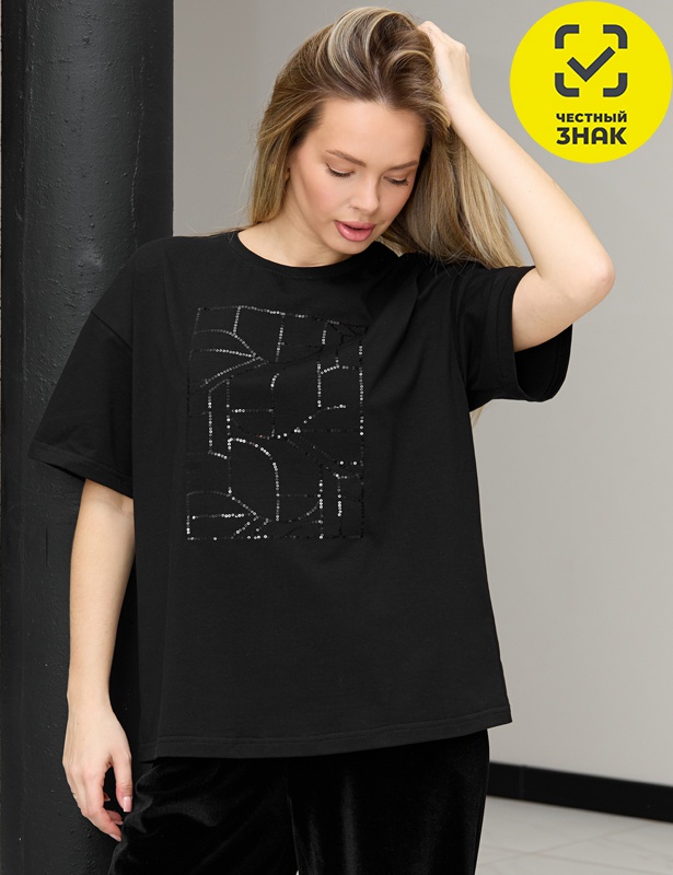 Футболка женская из гладкокрашенного трикотажного полотна «кулирка с лайкрой», свободного покроя, с короткими втачными рукавами, горловиной овальной формы, обработанной втачной планкой. По центру полочки выполнена вышивка «пайетками» в тон изделия