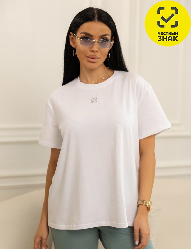 Футболка женская базовая, прямого силуэта. Длиной до уровня бедра. Легкость и свобода в каждом движении. Рукав - короткий, спущенный. Вырез горловины - округлый. На передней части дизайнерский рисунок, выполненный в виде вышивки.