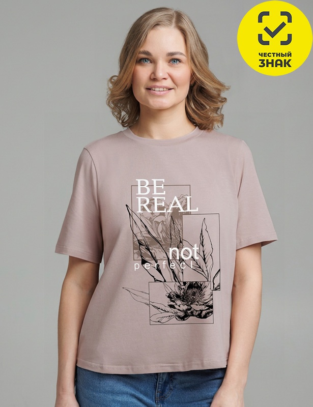 Женская футболка из трикотажного полотна с эластаном имеет короткий втачной рукав, прямой крой и округлую горловину, на полочке печать.
