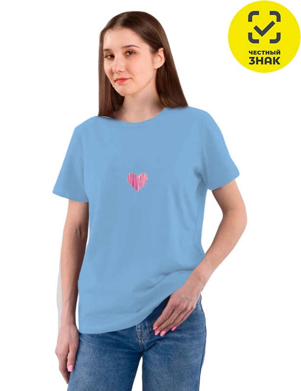 Женская футболка свободного кроя с короткими втачными рукавами, округлой горловиной и печатью на полочке — это классическая модель, подходящая для любого времени года и стиля одежды.