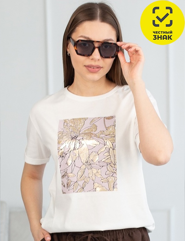 Футболка женская с короткими рукавами, свободного силуэта. Горловина круглая, обработана притачной бейкой. Перед футболки декорирован принтом.