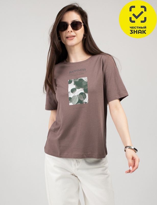 Футболка женская с короткими рукавами, свободного силуэта. Горловина круглая, обработана притачной бейкой. Перед футболки декорирован принтом.