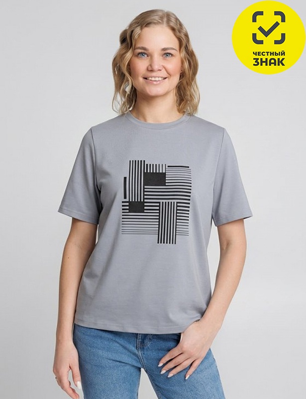 Женская футболка из трикотажного полотна с эластаном имеет короткий втачной рукав, прямой крой и округлую горловину, на полочке печать.