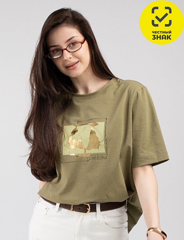 Футболка женская с короткими рукавами, свободного силуэта. Горловина круглая, обработана притачной бейкой. Перед футболки декорирован принтом.