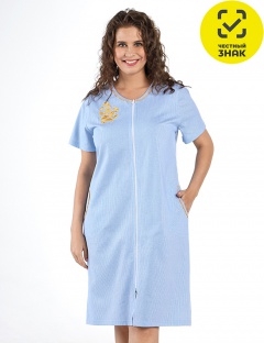 Халат из трикотажного полотна «кулирка» с набивным рисунком в полоску, прямого силуэта, с короткими втачными рукавами, горловиной овальной формы, карманами в боковых швах и центральной бортовой застежкой на тесьму «молния». Горловина и входы в карманы окантованы двойным кантом.