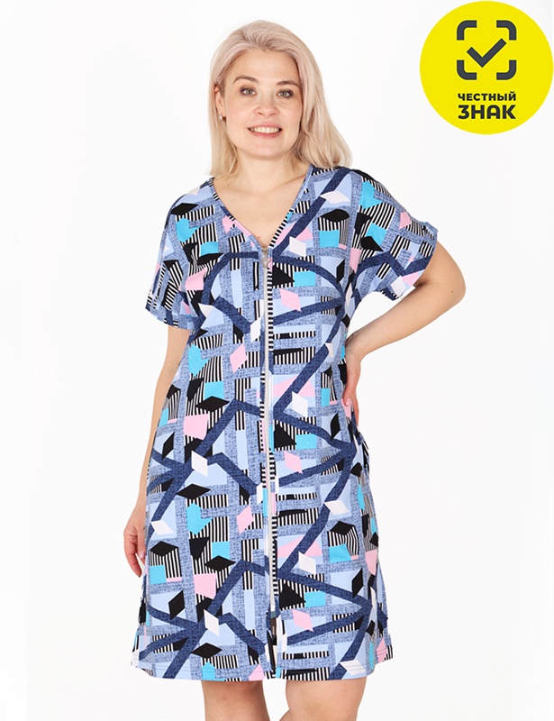Лаконичный халат из легкой ткани в составе 100% хлопок, ткань с принтом. Модель прямого силуэта, без воротника, со спущенным коротким рукавом и центральной застёжкой на молнию. Халат с функциональными карманами.