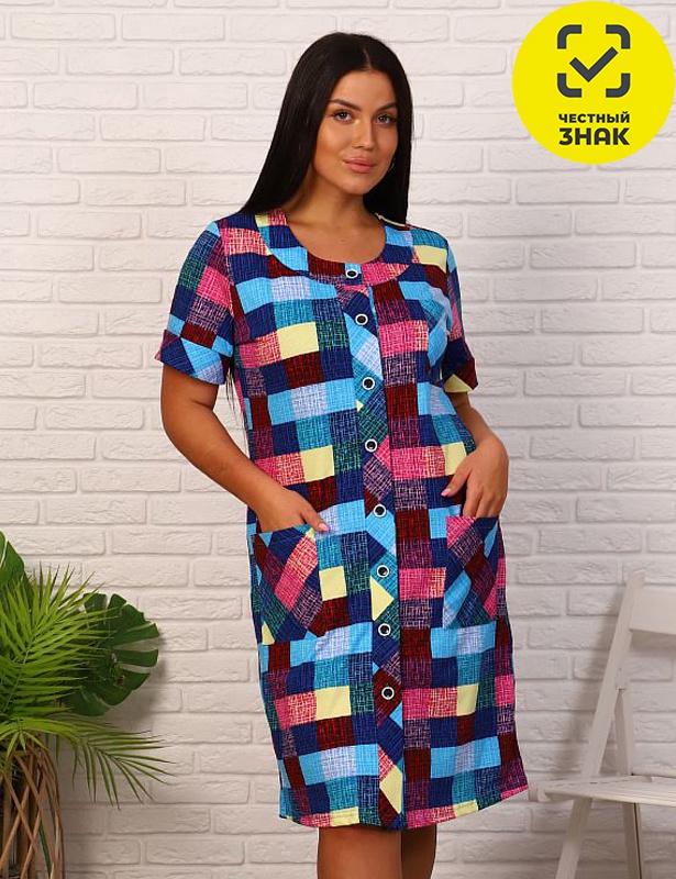 Халат женский из набивной кулирки с короткими втачными рукавами с отворотами, округлый вырез горловины, центральная застежка на пуговицы-петли. Накладные карманы на полочках.