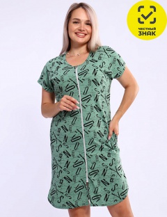 Халат женский на молнии из 100% хлопка. Ткань кулирка набивная. Рукав – спущенный, короткий. Силуэт прямой, свободный, с карманами в боковых швах. Низ фигурный под окантовку.