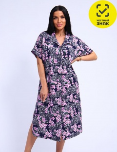 Халат женский из набивной кулирки, с короткими втачными рукавами, центральной застежкой на пуговицы-петли, карманами в боковых швах. V-образная горловина с отложенным воротником.